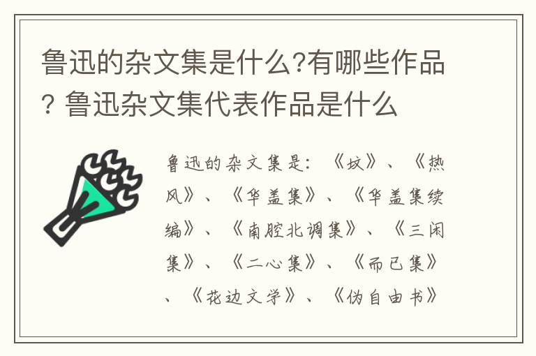 作品:主要以小说、杂文为主,代表作有:小说集《呐喊》《彷徨》《故事新编》等;散文集《朝花夕拾》;散文诗集《野草》;杂文集《坟》《热风》《华盖集》《华盖集续编》《南腔北调集》《三闲集》《二心集》《而已集》《且介亭杂文》等。