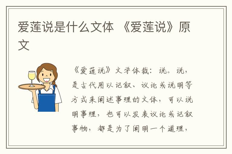 《爱莲说》文学体裁:说。说,是古代用以记叙、议论或说明等方式来阐述事理的文体,可以说明事理,也可以发表议论或记叙事物,都是为了阐明一个道理,往往是借一件事情或一种现象来表述作者对某些事物或问题的见解,篇幅一般不长。跟现在的杂文大体相似。