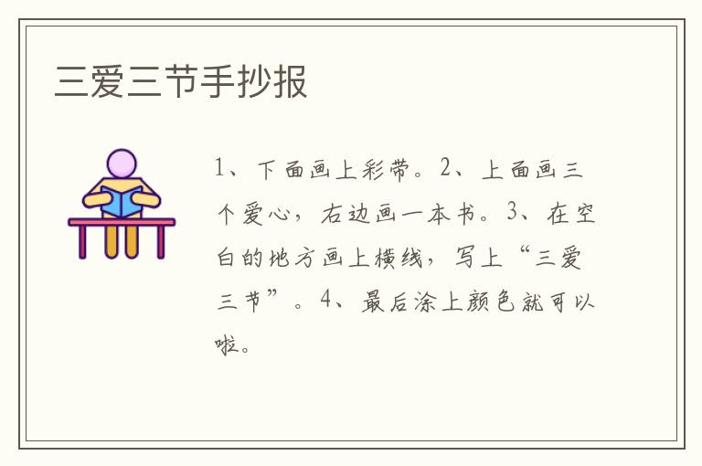 三爱三节手抄报 知识分享 23年2月11日 编辑 童画 取消关注 关注 私信 1、下面画上彩带。 2、上面画三个爱心,右边画一本书。 3、在空白的地方画上横线,写上“三爱三节”。 4、最后涂上颜色就可以啦。 No related posts. 本文内容由互联网用户自发贡献,该文观点仅代表作者本人。本站仅提供信息存储空间服务,不拥有所有权,不承担相关法律责任。如发现本站有涉嫌抄袭侵权/违法违规的内容, 请发送邮件至 2245678901@qq.com 举报,一经查实,本站将立刻删除。 给TA打赏 共{{data.count}}人 人已打赏