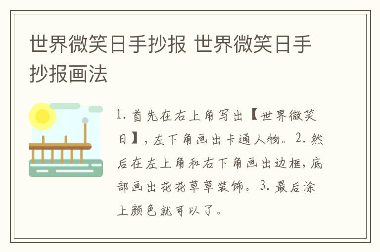 世界微笑日手抄报 世界微笑日手抄报画法 知识分享 23年2月11日 编辑 童画 取消关注 关注 私信 1.首先在右上角写出【世界微笑日】,左下角画出卡通人物。 2.然后在左上角和右下角画出边框,底部画出花花草草装饰。 3.最后涂上颜色就可以了。 No related posts. 本文内容由互联网用户自发贡献,该文观点仅代表作者本人。本站仅提供信息存储空间服务,不拥有所有权,不承担相关法律责任。如发现本站有涉嫌抄袭侵权/违法违规的内容, 请发送邮件至 2245678901@qq.com 举报,一经查实,本站将立刻删除。 给TA打赏 共{{data.count}}人 人已打赏