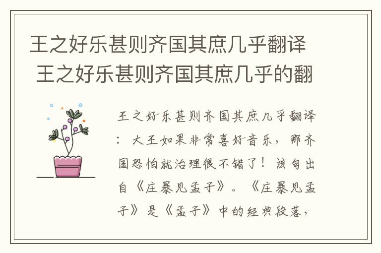 王之好乐甚则齐国其庶几乎翻译:大王如果非常喜好音乐,那齐国恐怕就治理很不错了!该句出自《庄暴见孟子》。《庄暴见孟子》是《孟子》中的经典段落,节选自《孟子·梁惠王下》,内容以庄暴和孟子的对话为形式,阐述孟子想要告诉君主仁君应“与民同乐”、实行“仁政”的基本儒家思想。