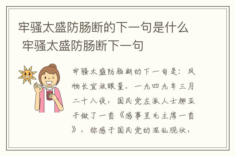 牢骚太盛防肠断的下一句是什么 牢骚太盛防肠断下一句 知识分享 23年2月11日 编辑 童画 取消关注 关注 私信 牢骚太盛防肠断的下一句是:风物长宜放眼量。一九四九年三月二十八夜,国民党左派人士柳亚子做了一首《感事呈毛主席一首》,称感于国民党的混乱现状,要回家乡分湖隐居。4月,毛泽东同志写《七律·和柳亚子先生》一词回赠,用严子陵隐居垂钓富春江畔这件事,劝柳亚子先生留在北京继续参加建国工作。 No related posts. 本文内容由互联网用户自发贡献,该文观点仅代表作者本人。本站仅提供信息存储空间服务,不拥有所有权,不承担相关法律责任。如发现本站有涉嫌抄袭侵权/违法违规的内容, 请发送邮件至 2245678901@qq.com 举报,一经查实,本站将立刻删除。 给TA打赏 共{{data.count}}人 人已打赏