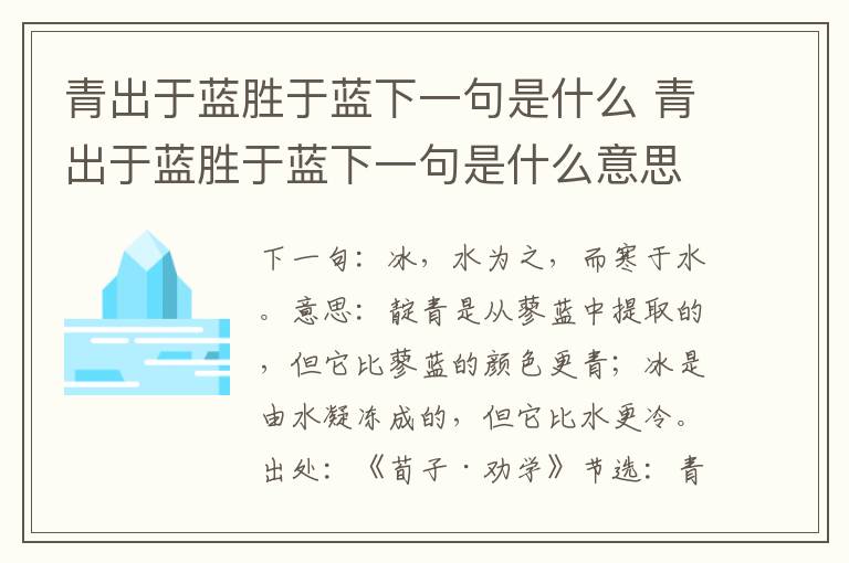 下一句:冰,水为之,而寒于水。意思:靛青是从蓼蓝中提取的,但它比蓼蓝的颜色更青;冰是由水凝冻成的,但它比水更冷。出处:《荀子·劝学》节选:青,取之于蓝,而青于蓝;冰,水为之,而寒于水。木直中绳,輮以为轮,其曲中规。虽有槁暴,不复挺者,輮使之然也。故木受绳则直,金就砺则利,君子博学而日参省乎已,则知明而行无过矣。