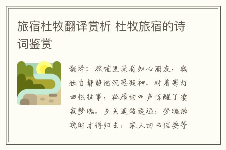 翻译:旅馆里没有知心朋友,我独自静静地沉思凝神。对着寒灯回忆往事,孤雁的叫声惊醒了凄寂梦魂。乡关道路迢远,梦魂拂晓时才得归去,家人的书信要等来年方能寄到此地。沧江上月色含烟,风光多美,钓鱼船就系在我家门前。赏析:《旅宿》是杜牧写的一首羁旅怀乡诗,表达了作者旅况的索寞凄凉和对家乡的深切思念的感情。