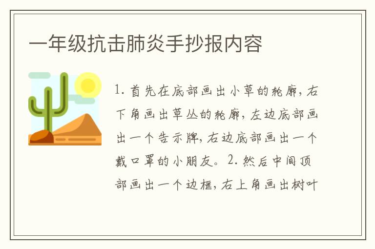 一年级抗击肺炎手抄报内容 知识分享 23年2月11日 编辑 童画 取消关注 关注 私信 1.首先在底部画出小草的轮廓,右下角画出草丛的轮廓,左边底部画出一个告示牌,右边底部画出一个戴口罩的小朋友。 2.然后中间顶部画出一个边框,右上角画出树叶的轮廓和装饰的心。 3.最后填上内容、涂上颜色就可以了。 No related posts. 本文内容由互联网用户自发贡献,该文观点仅代表作者本人。本站仅提供信息存储空间服务,不拥有所有权,不承担相关法律责任。如发现本站有涉嫌抄袭侵权/违法违规的内容, 请发送邮件至 2245678901@qq.com 举报,一经查实,本站将立刻删除。 给TA打赏 共{{data.count}}人 人已打赏