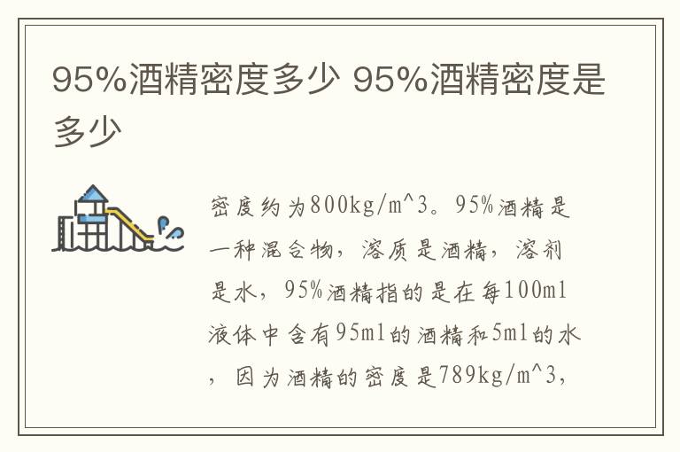 95%酒精是一种混合物,溶质是酒精,溶剂是水,95%酒精指的是在每100ml液体中含有95ml的酒精和5ml的水,因为酒精的密度是789kg/m^3,水的密度是1000kg/m^3,所以95%酒精密度的算法为(789×95+1000×5)÷100≈800kg/m^3。