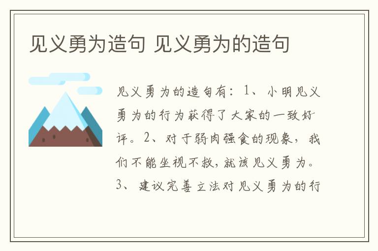 见义勇为的造句有:1、小明见义勇为的行为获得了大家的一致好评。2、对于弱肉强食的现象,我们不能坐视不救,就该见义勇为。3、建议完善立法对见义勇为的行为进行宣传和适当的保护,以激励更多的人见义勇为,提升社会道德水平。