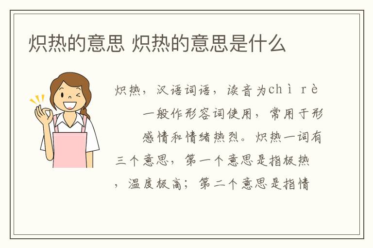 炽热,汉语词语,读音为chì rè,一般作形容词使用,常用于形容感情和情绪热烈。炽热一词有三个意思,第一个意思是指极热,温度极高;第二个意思是指情绪等热烈;第三个意思是烧热。词语出自蔡东藩、《五代史演义》第七回:“外用炭火炽热,令他煨毙。”