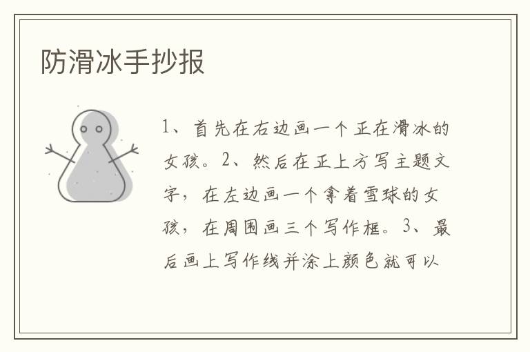 防滑冰手抄报 知识分享 23年2月11日 编辑 童画 取消关注 关注 私信 1、首先在右边画一个正在滑冰的女孩。 2、然后在正上方写主题文字,在左边画一个拿着雪球的女孩,在周围画三个写作框。 3、最后画上写作线并涂上颜色就可以了。 No related posts. 本文内容由互联网用户自发贡献,该文观点仅代表作者本人。本站仅提供信息存储空间服务,不拥有所有权,不承担相关法律责任。如发现本站有涉嫌抄袭侵权/违法违规的内容, 请发送邮件至 2245678901@qq.com 举报,一经查实,本站将立刻删除。 给TA打赏 共{{data.count}}人 人已打赏