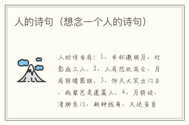 人的诗句有:1、举杯邀明月,对影成三人。2、人有悲欢离合,月有阴晴圆缺。3、仰天大笑出门去,我辈岂是蓬蒿人。4、月桥边,清柳朱门,断钟残角,又送黄昏,心中事,眼中泪,意中人。5、天涯流落思无穷,既相逢,却匆匆,携手佳人,和泪折残红。6、燕子飞时,绿水人家绕,枝上柳绵吹又少,天涯何处无芳草。