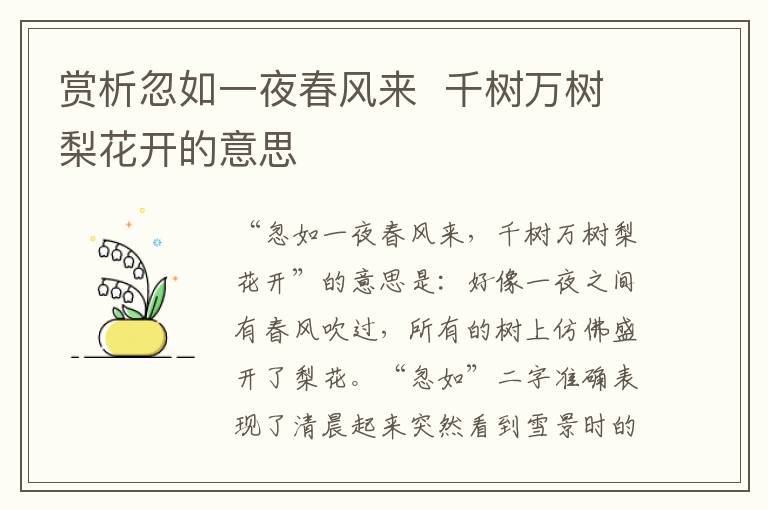 “忽如一夜春风来,千树万树梨花开”的意思是:好像一夜之间有春风吹过,所有的树上仿佛盛开了梨花。“忽如”二字准确表现了清晨起来突然看到雪景时的惊奇情形,传出诗人惊喜好奇的神情。经过一夜的大雪,大地一片银装素裹,焕然一新。以“春风”使“梨花”盛开,比拟北风使雪花飞舞比作春风使梨花盛开,极为新颖贴切。诗人以雪喻花,匠心独运,构思奇巧,意境奇绝,是千古传颂的名句。