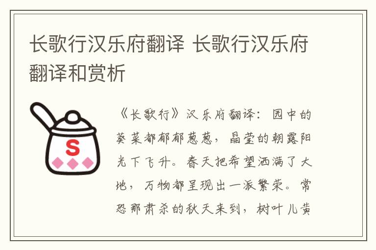 《长歌行》汉乐府翻译:园中的葵菜都郁郁葱葱,晶莹的朝露阳光下飞升。春天把希望洒满了大地,万物都呈现出一派繁荣。常恐那肃杀的秋天来到,树叶儿黄落百草也凋零。百川奔腾着东流到大海,何时才能重新返回西境?少年人如果不及时努力,到老来只能是悔恨一生。