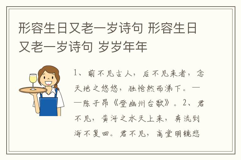 1、前不见古人,后不见来者,念天地之悠悠,独怆然而涕下。——陈子昂《登幽州台歌》。2、君不见,黄河之水天上来,奔流到海不复回。君不见,高堂明镜悲白发,朝如青丝暮成雪。——李白《将进酒》。3、及时当勉励,岁月不待人。——陶渊明《杂诗》。4、闲云潭影日悠悠,物换星移几度秋?阁中帝子今何在,槛外长江空自流。——王勃《滕王阁诗》
