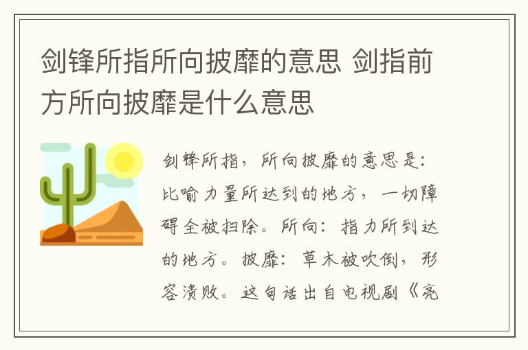 剑锋所指,所向披靡的意思是:比喻力量所达到的地方,一切障碍全被扫除。所向:指力所到达的地方。披靡:草木被吹倒,形容溃败。