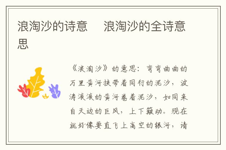 《浪淘沙》的意思:弯弯曲曲的万里黄河挟带着同行的泥沙,波涛滚滚的黄河卷着泥沙如同来自天边的巨风,上下簸动。现在就好像要直飞上高空的银河,请你带上我一起去寻访牛郎织女的家。