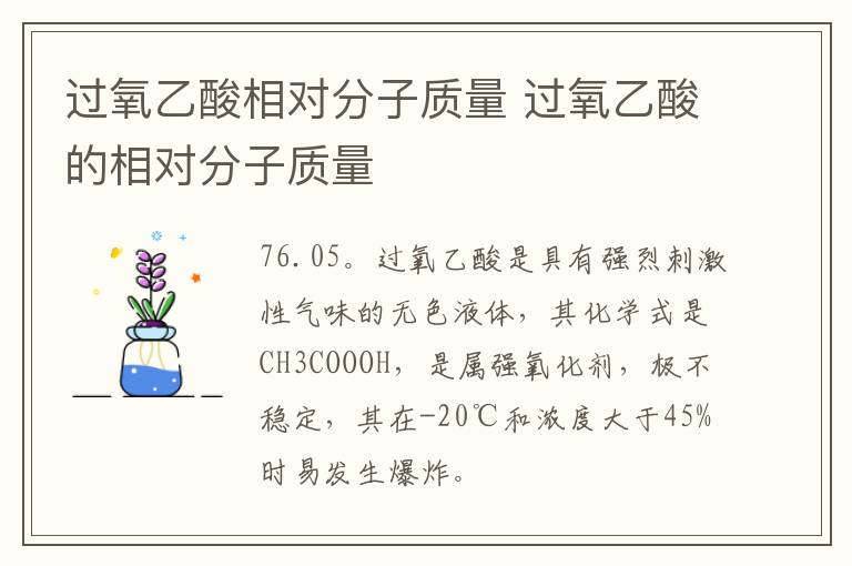 过氧乙酸相对分子质量 过氧乙酸的相对分子质量 知识分享 23年2月11日 编辑 童画 取消关注 关注 私信 过氧乙酸的相对分子质量是76.05。过氧乙酸是具有强烈刺激性气味的无色液体,其化学式是CH3COOOH,是属强氧化剂,极不稳定,其在-20℃和浓度大于45%时易发生爆炸。 No related posts. 本文内容由互联网用户自发贡献,该文观点仅代表作者本人。本站仅提供信息存储空间服务,不拥有所有权,不承担相关法律责任。如发现本站有涉嫌抄袭侵权/违法违规的内容, 请发送邮件至 2245678901@qq.com 举报,一经查实,本站将立刻删除。 给TA打赏 共{{data.count}}人 人已打赏