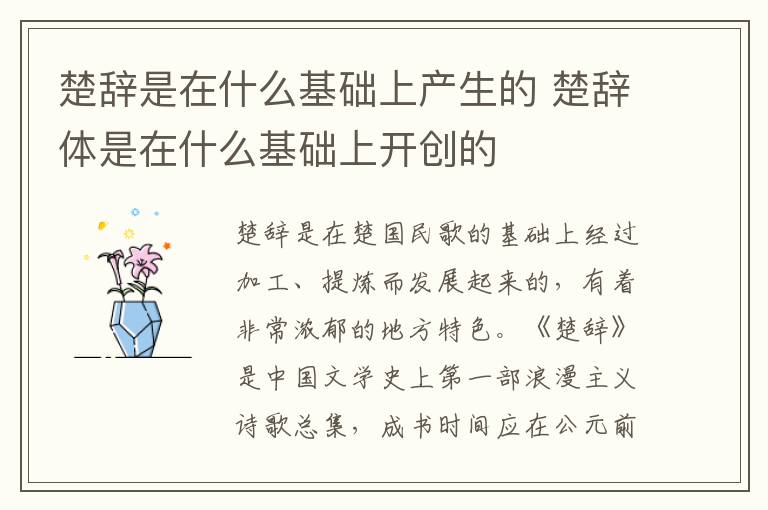 楚辞是在楚国民歌的基础上经过加工、提炼而发展起来的,有着非常浓郁的地方特色。楚辞是出国诗人屈原创作的诗歌体裁,他创作的《离骚》是楚辞的代表作,楚辞因此又称作“骚体”。