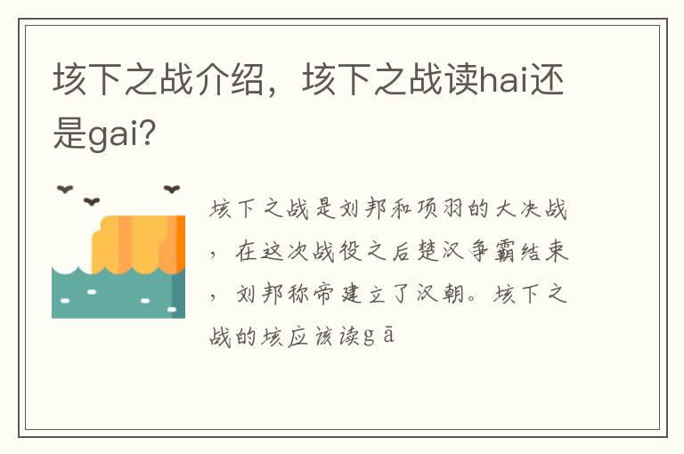 垓下之战是刘邦和项羽的大决战,在这次战役之后楚汉争霸结束,刘邦称帝建立了汉朝。垓下之战的垓应该读gāi,垓下就是指现今安徽省灵璧县东南沱河北岸。