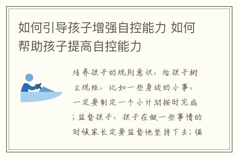培养孩子的规则意识,给孩子树立规矩,比如一些身边的小事,一定要制定一个小计划按时完成;监督孩子,孩子在做一些事情的时候家长定要监督他坚持下去;循序渐进及时表扬,父母要有耐性,不能操之过急,对于孩子表现良好的自控行为,要给与及时的表扬和鼓励。