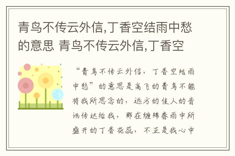 青鸟不传云外信,丁香空结雨中愁的意思 青鸟不传云外信,丁香空结雨中愁的翻译 知识分享 23年2月12日 编辑 童画 取消关注 关注 私信 “青鸟不传云外信,丁香空结雨中愁”的意思是高飞的青鸟不能将我所思念的,远方的佳人的音讯传达给我,那在缠绵春雨中所盛开的丁香花蕊,不正是我心中那一团团的忧愁吗?此句出自著名诗人李璟所写的词《摊破浣溪沙·手卷真珠上玉钩》。 No related posts. 本文内容由互联网用户自发贡献,该文观点仅代表作者本人。本站仅提供信息存储空间服务,不拥有所有权,不承担相关法律责任。如发现本站有涉嫌抄袭侵权/违法违规的内容, 请发送邮件至 2245678901@qq.com 举报,一经查实,本站将立刻删除。 给TA打赏 共{{data.count}}人 人已打赏