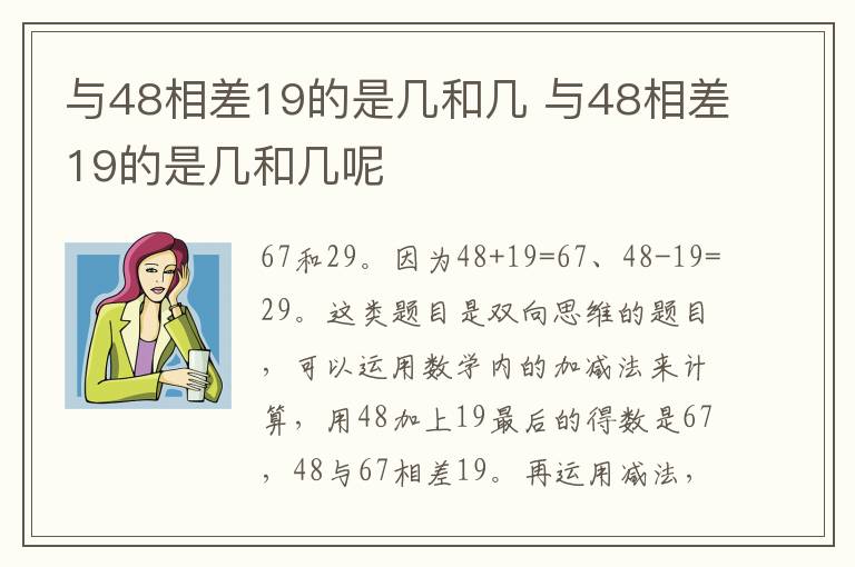与48相差19的是67和29,因为48+19=67、48-19=29。这类题目是双向思维的题目,可以运用数学内的加减法来计算,用48加上19最后的得数是67,48与67相差19。再运用减法,48减去19得数是29,因此48与29相差19。