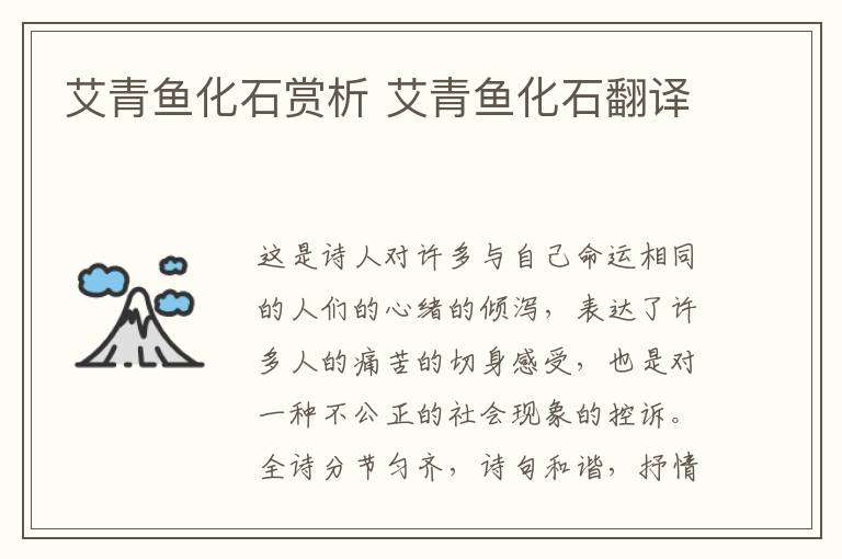 《鱼化石》是现代诗人艾青于1978年创作的一首新诗。作者着力在描绘鱼化石,用极朴素平易的语言,却把鱼化石的具像描绘得栩栩如生。在描绘鱼化石的同时,又使人无不感到诗人是在倾泻自己的深刻思考。诗人是在写“鱼”,也是在写人,他把自己的体验和思考表达得如此深刻,是因为自己有着痛苦的切身感受。