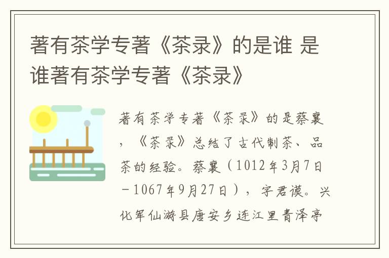 著有茶学专著《茶录》的是蔡襄,《茶录》总结了古代制茶、品茶的经验。蔡襄(1012年3月7日-1067年9月27日),字君谟。兴化军仙游县唐安乡连江里青泽亭境蔡坑(今福建省仙游县枫亭镇九社村蔡坑自然村)人。北宋名臣,书法家、文学家、茶学家。
