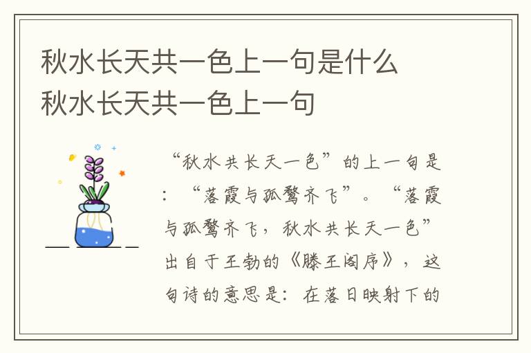 “秋水共长天一色”的上一句是:“落霞与孤鹜齐飞”。“落霞与孤鹜齐飞,秋水共长天一色”出自于王勃的《滕王阁序》,这句诗的意思是:在落日映射下的彩霞与孤独的大雁一起在天空中飞翔,秋天的江水和辽阔的天空连成一片,浑然一色。
