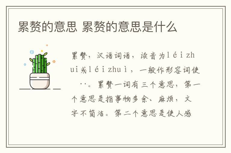 累赘,汉语词语,读音为léi zhui或léi zhuì,一般作形容词使用。累赘一词有三个意思,第一个意思是指事物多余、麻烦,文字不简洁。第二个意思是使人感到多余或麻烦。第三个意思是使人感到多余、麻烦的事物。词语出自《红楼梦》第三七回:“‘居士’‘主人’到底不雅,又累赘。”