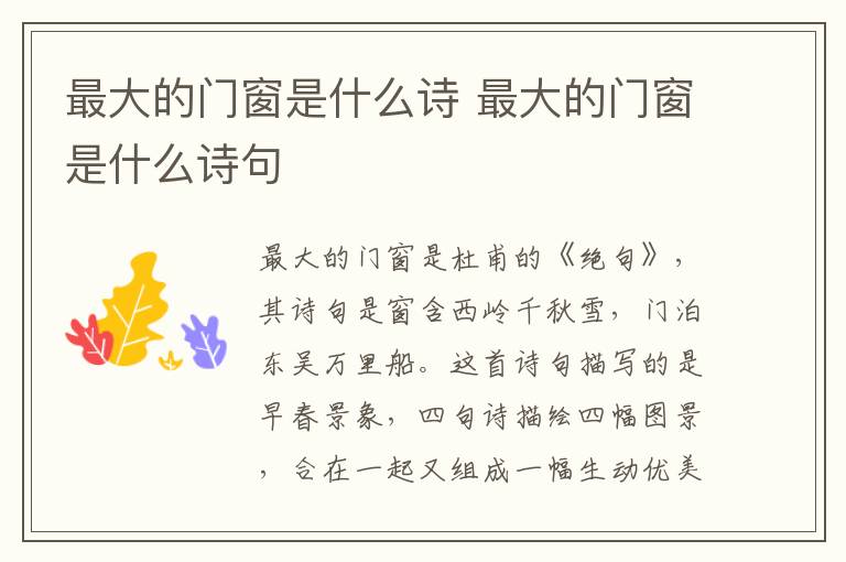 最大的门窗是杜甫的《绝句》,其诗句是窗含西岭千秋雪,门泊东吴万里船。这首诗句描写的是早春景象,四句诗描绘四幅图景,合在一起又组成一幅生动优美的风景画。