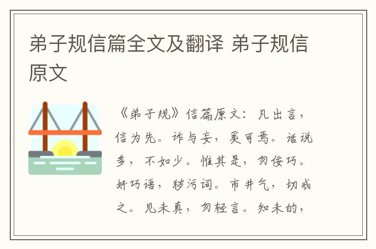 《弟子规》信篇原文:凡出言,信为先。诈与妄,奚可焉。话说多,不如少。惟其是,勿佞巧。奸巧语,秽污词。市井气,切戒之。见未真,勿轻言。知未的,勿轻传。事非宜,勿轻诺。苟轻诺,进退错。凡道字,重且舒。勿急疾,勿模糊。彼说长,此说短。不关己,莫闲管。见人善,即思齐。纵去远,以渐跻。见人恶,即内省。有则改,无加警。唯德学,唯才艺。不如人,当自砺。若衣服,若饮食。不如人,勿生戚。闻过怒,闻誉乐。损友来,益友却。闻誉恐,闻过欣。直谅士,渐相亲。无心非,名为错。有心非,名为恶。过能改,归于无。倘掩饰,增一辜。