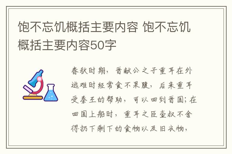 《饱不忘饥》的主要内容:春秋时期,晋献公之子重耳在外逃难时经常食不果腹,后来重耳受秦王的帮助,可以回到晋国;在回国上船时,重耳之臣壶叔不舍得扔下剩下的食物以及旧衣物,但重耳认为自己是回国做国君,让人扔下那些东西。有人认为重耳是未得富贵就忘了贫贱,重耳认识到错误,把那些破烂东西带回了国。