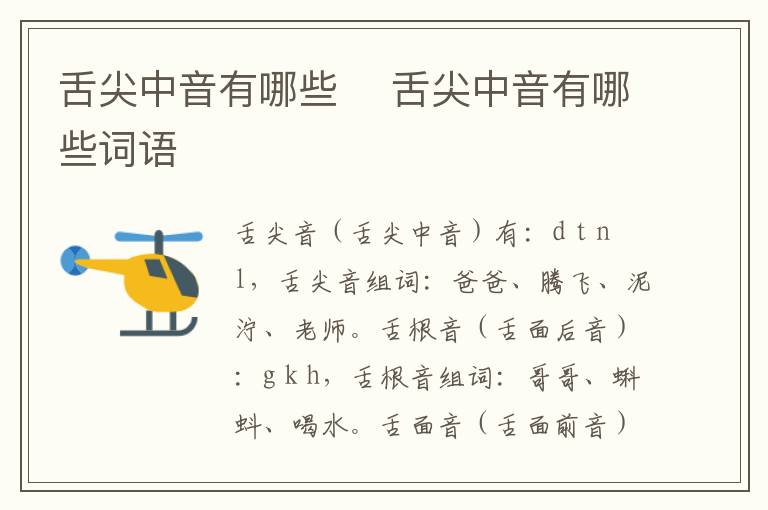 舌尖音(舌尖中音)有:d t n l,舌尖音组词:爸爸、腾飞、泥泞、老师。舌根音(舌面后音):g k h,舌根音组词:哥哥、蝌蚪、喝水。舌面音(舌面前音):j q x,舌面音组词:经济、奇怪、西瓜。翘舌音(舌尖后音):zh ch sh r,翘舌音组词:知道、吃饭、施肥、忍让。