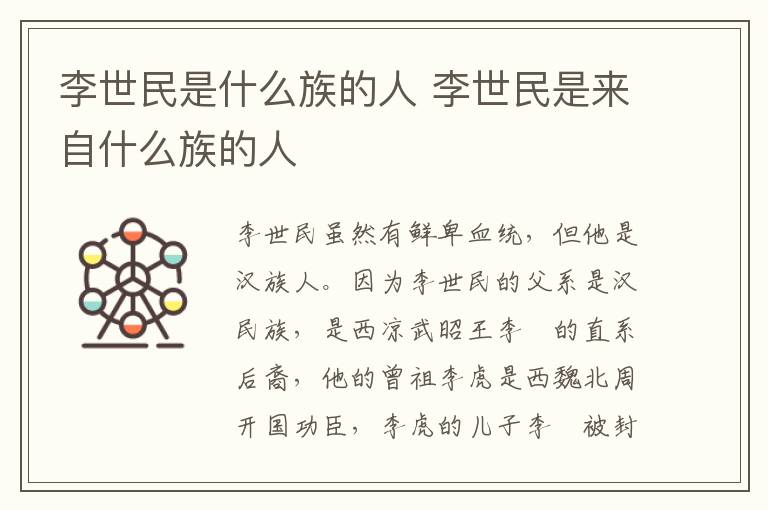 李世民虽然有鲜卑血统,但他是汉族人。因为李世民的父系是汉民族,是西凉武昭王李暠的直系后裔,他的曾祖李虎是西魏北周开国功臣,李虎的儿子李昺被封唐国公娶了鲜卑人独孤信的女儿,李昺的儿子就是李渊,娶的老婆是鲜卑贵族窦氏,窦氏生了李世民。