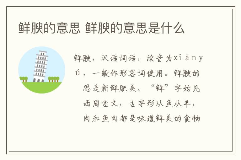 鲜腴,汉语词语,读音为xiān yú,一般作形容词使用。鲜腴的意思是新鲜肥美。“鲜”字始见于西周金文,古字形从鱼从羊,羊肉和鱼肉都是味道鲜美的食物,本义为新鲜味美。
