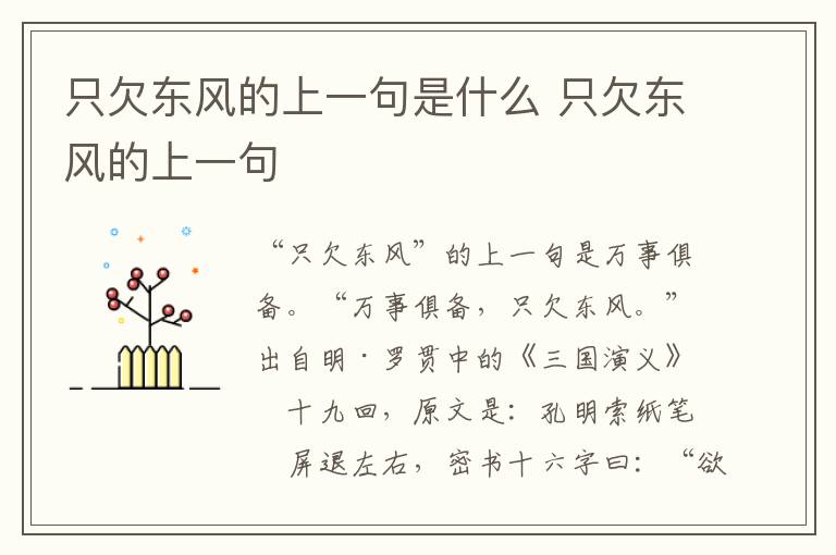 “只欠东风”的上一句是万事俱备。“万事俱备,只欠东风。”出自明·罗贯中的《三国演义》四十九回,原文是:孔明索纸笔,屏退左右,密书十六字曰:“欲破曹公,须用火攻,万事俱备,只欠东风。”