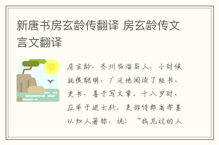 房玄龄,齐州临淄县人。小时候就很聪明,广泛地阅读了经书、史书,善于写文章。十八岁时,应举于进士科。吏部侍郎高孝基以知人著称,说:“我见过的人很多,还没见过这样的年轻人,(他日后)一定是国家的栋梁。”补任牒城尉,见中原正乱,慨然而有忧天下的志向。适逢父亲生病,历时十旬,玄龄衣不解带服侍;待父亲去世后,五天滴水不进。太宗率兵巡行渭北,房玄龄杖策拜见太宗于军门,太宗与他一见如故。玄龄已经遇到了知己的人,偏用尽自己的全部心力,知道的没有不马上去做的。每次平定贼寇,众人争着去寻找珍宝古玩,只有玄龄先接受杰出人物,安置到幕府中。当有谋臣猛将,都跟他们暗中互相结交,各人都表示愿为太宗竭尽死力。玄龄在李市民秦王府中十多年,常负责管理文牍,每逢写军书奏章,停马立即可成。文字简约义理充足。一开始就不用草稿。高祖曾经对侍臣说:“这个人深重地了解机宜,足能委以重任。每当替我儿陈说事务,一定能了解人的心理,千里之外,好像对面说话一样。”