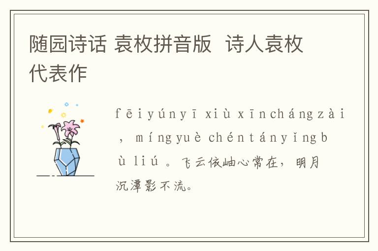 《随园诗话》是清代袁枚的诗歌美学和诗歌理论著作,是清代影响最大的一部诗话。其体制为分条排列,每条或述一评,或记一事,或采一诗(或数诗),乃随笔式。本书的编撰,旨在倡导性灵说诗论,以反对乾隆诗坛流行的沈德潜格调说与翁方纲以考据为诗的风气。