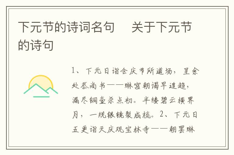 1、下元日诣会庆节所道场,呈余处恭尚书——琳宫朝谒早追趋,漏尽铜壶杀点初。半缕碧云横界月,一规银镜裂成梳。2、下元日五更诣天庆观宝林寺——朝罢琳宫谒宝坊,强扶衰疾具簪裳。拥裘假寐篮舆稳,夹道吹烟桦炬香。楼外晓星犹磊落,山头初日已苍凉。鸣驺应有高人笑,五斗驱君早夜忙。3、鄱湖渔歌:下元节五八初度——虚龄称甲子,初度值霜天。沧海帆方满,瑶池月正圆。
