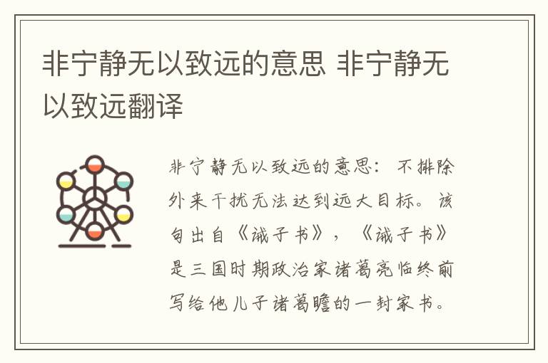 非宁静无以致远的意思:不排除外来干扰无法达到远大目标。该句出自《诫子书》,《诫子书》是三国时期政治家诸葛亮临终前写给他儿子诸葛瞻的一封家书。文章阐述修身养性、治学做人的深刻道理。从文中可以看出诸葛亮是一位品格高洁、才学渊博的父亲,对儿子的殷殷教诲与无限期望尽在此书中。