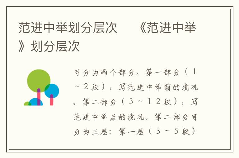 可分为两个部分。第一部分(1~2段),写范进中举前的境况。第二部分(3~12段),写范进中举后的境况。第二部分可分为三层:第一层(3~5段),讽刺了世态炎凉,刻画了范进发疯后的丑态。第二层(6~10段),写范进发疯后,乡邻们请胡屠户“打”醒范进以及胡屠户对新贵人的奴颜婢膝。这段课文主要讽刺了胡屠户的势利、无耻。第三层(11~12段),写范进中举后,张乡绅来访以及范进骤然富贵的情形。