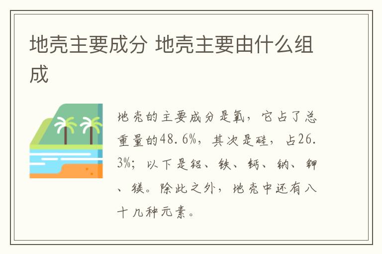 地壳的主要成分是氧,它占了总重量的48.6%,其次是硅,占26.3%;以下是铝、铁、钙、钠、钾、镁。除此之外,地壳中还有八十几种元素。