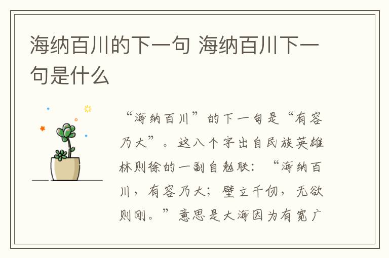 “海纳百川”的下一句是“有容乃大”。这八个字出自民族英雄林则徐的一副自勉联:“海纳百川,有容乃大;壁立千仞,无欲则刚。”意思是大海因为有宽广的度量才容纳了成百上千条河流;高山因为没有勾心斗角的凡世杂欲才如此挺拔。
