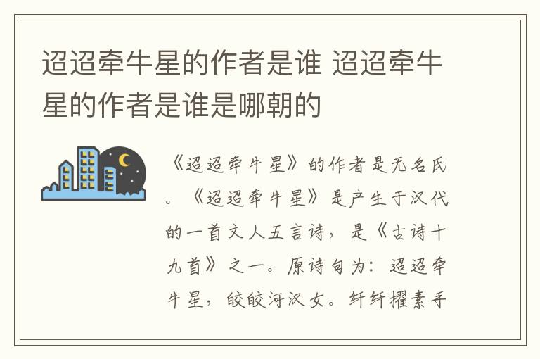 《迢迢牵牛星》的作者是无名氏。《迢迢牵牛星》是产生于汉代的一首文人五言诗,是《古诗十九首》之一。原诗句为:迢迢牵牛星,皎皎河汉女。纤纤擢素手,札札弄机杼。终日不成章,泣涕零如雨;河汉清且浅,相去复几许!盈盈一水间,脉脉不得语。