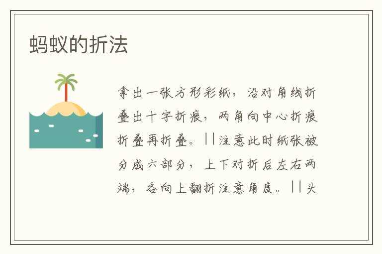 蚂蚁的折法 知识分享 23年2月12日 编辑 童画 取消关注 关注 私信 1、拿出一张方形彩纸,沿对角线折叠出十字折痕,两角向中心折痕折叠再折叠。 2、注意此时纸张被分成六部分,上下对折后左右两端,各向上翻折注意角度。 3、头部和尾部尖角收折进去,画上眼睛,蚂蚁就完成了。 No related posts. 本文内容由互联网用户自发贡献,该文观点仅代表作者本人。本站仅提供信息存储空间服务,不拥有所有权,不承担相关法律责任。如发现本站有涉嫌抄袭侵权/违法违规的内容, 请发送邮件至 2245678901@qq.com 举报,一经查实,本站将立刻删除。 给TA打赏 共{{data.count}}人 人已打赏