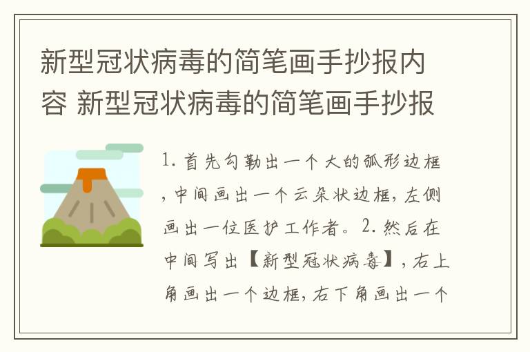 新型冠状病毒的简笔画手抄报内容 新型冠状病毒的简笔画手抄报内容画法 知识分享 23年2月12日 编辑 童画 取消关注 关注 私信 1.首先勾勒出一个大的弧形边框,中间画出一个云朵状边框,左侧画出一位医护工作者。 2.然后在中间写出【新型冠状病毒】,右上角画出一个边框,右下角画出一个边框并画出横线,边框的左边画出一支笔。 3.最后填上内容、涂上颜色就可以了。 No related posts. 本文内容由互联网用户自发贡献,该文观点仅代表作者本人。本站仅提供信息存储空间服务,不拥有所有权,不承担相关法律责任。如发现本站有涉嫌抄袭侵权/违法违规的内容, 请发送邮件至 2245678901@qq.com 举报,一经查实,本站将立刻删除。 给TA打赏 共{{data.count}}人 人已打赏