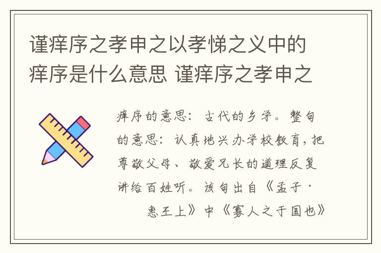 痒序的意思:古代的乡学。整句的意思:认真地兴办学校教育,把尊敬父母、敬爱兄长的道理反复讲给百姓听。该句出自《孟子·梁惠王上》中《寡人之于国也》一章,是表现孟子“仁政”思想的文章之一。