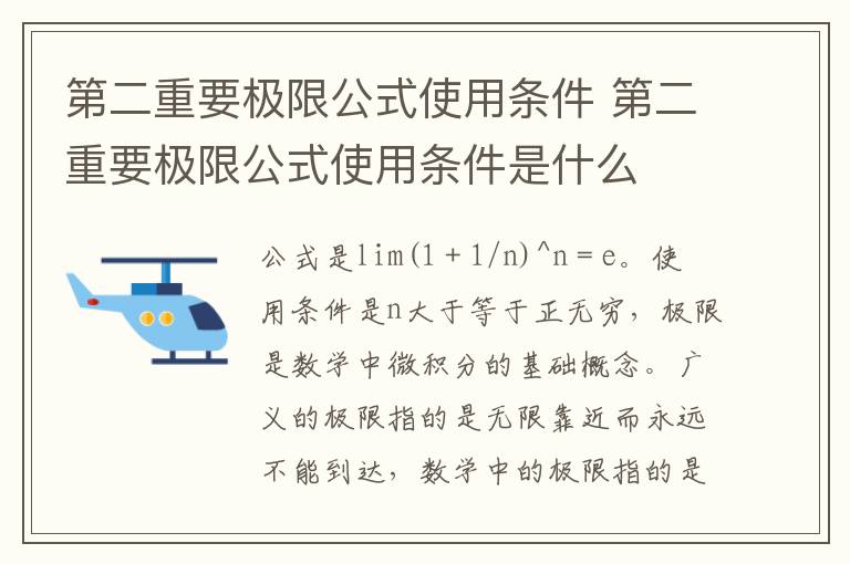 第二重要极限公式是lim(1 + 1/n)^n = e,使用条件是n大于等于正无穷,极限是数学中微积分的基础概念。