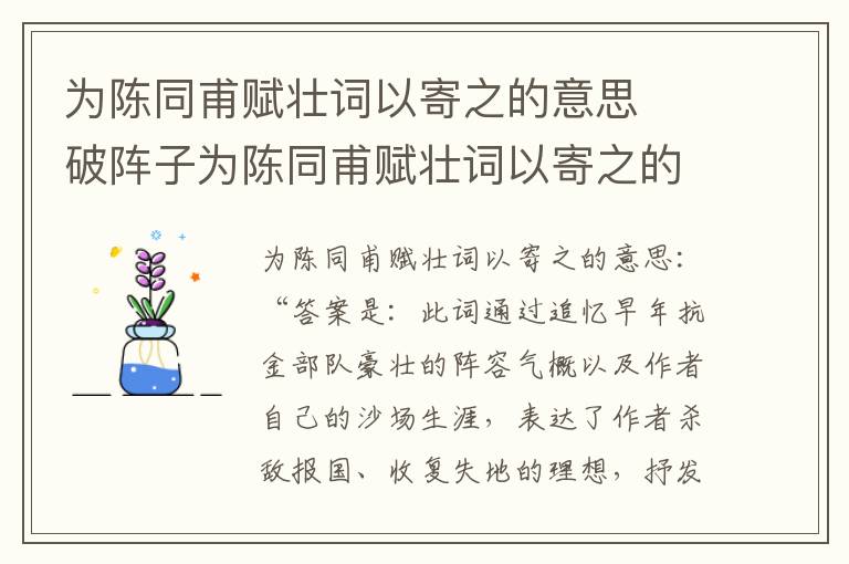 为陈同甫赋壮词以寄之的意思:“答案是:此词通过追忆早年抗金部队豪壮的阵容气概以及作者自己的沙场生涯,表达了作者杀敌报国、收复失地的理想,抒发了壮志难酬、英雄迟暮的悲愤心情;通过创造雄奇的意境,生动地描绘出一位披肝沥胆、忠一不二、勇往直前的将军形象”。