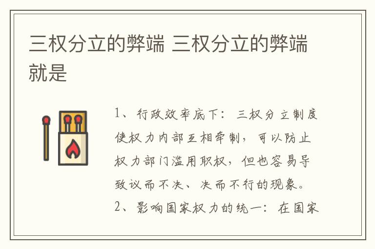 三权分立的弊端:1、行政效率底下:三权分立制度使权力内部互相牵制,可以防止权力部门滥用职权,但也容易导致议而不决、决而不行的现象。2、影响国家权力的统一:在国家重大问题上,权力机关内部很难达成意见统一。